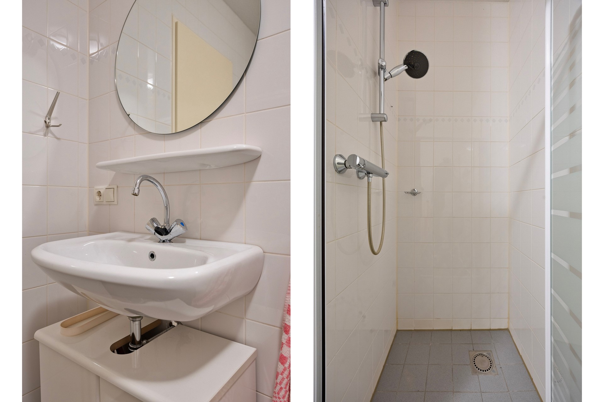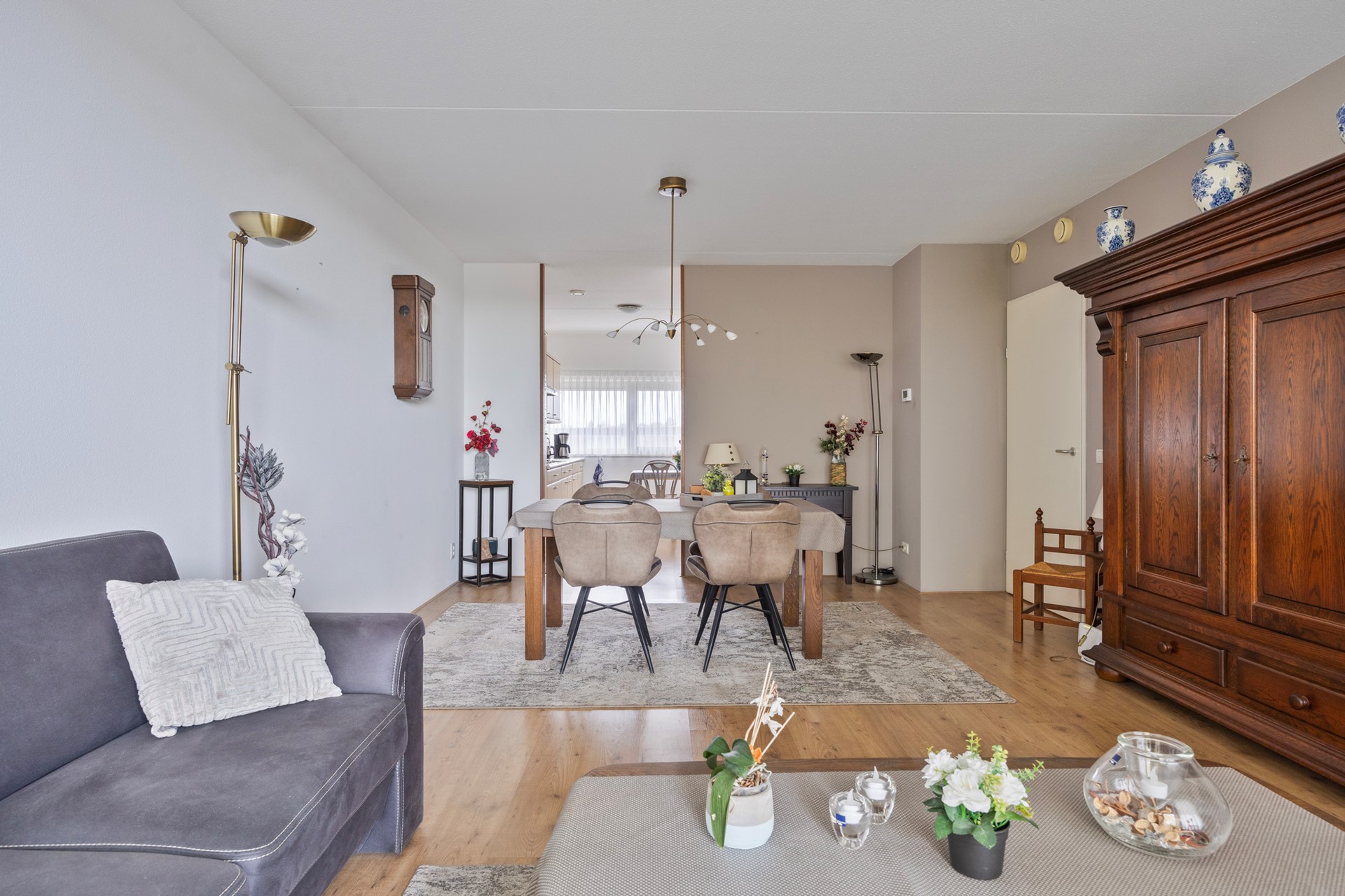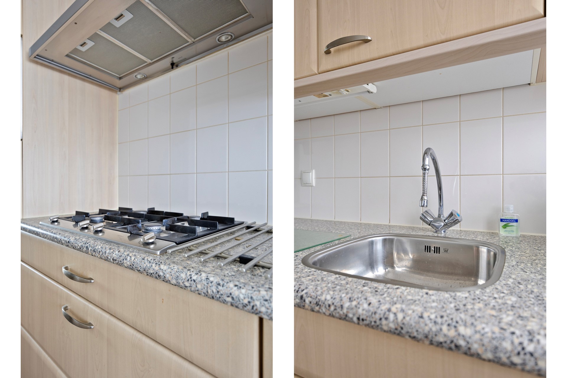 Woonkamer met open keuken: De woonkamer is met een oppervlakte van ca. 27 m² ruim en praktisch in te richten. Grote raampartijen zorgen voor veel lichtinval en een aangename sfeer. De open keuken is voorzien van een 4-pits gaskookplaat, afzuigkap, koelkast, vaatwasser, magnetron en diverse boven- en onderkasten. Ook de keukenzijde ligt aan de galerij, waarbij de ramen eveneens zijn uitgerust met screen.
