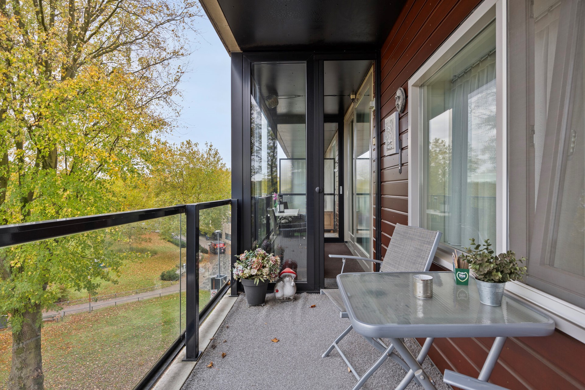 Vanuit de woonkamer is er toegang tot het zeer ruime balkon, dat gedeeltelijk is voorzien van een glazen wand. Hierdoor kunt u het hele jaar door genieten van deze buitenruimte.