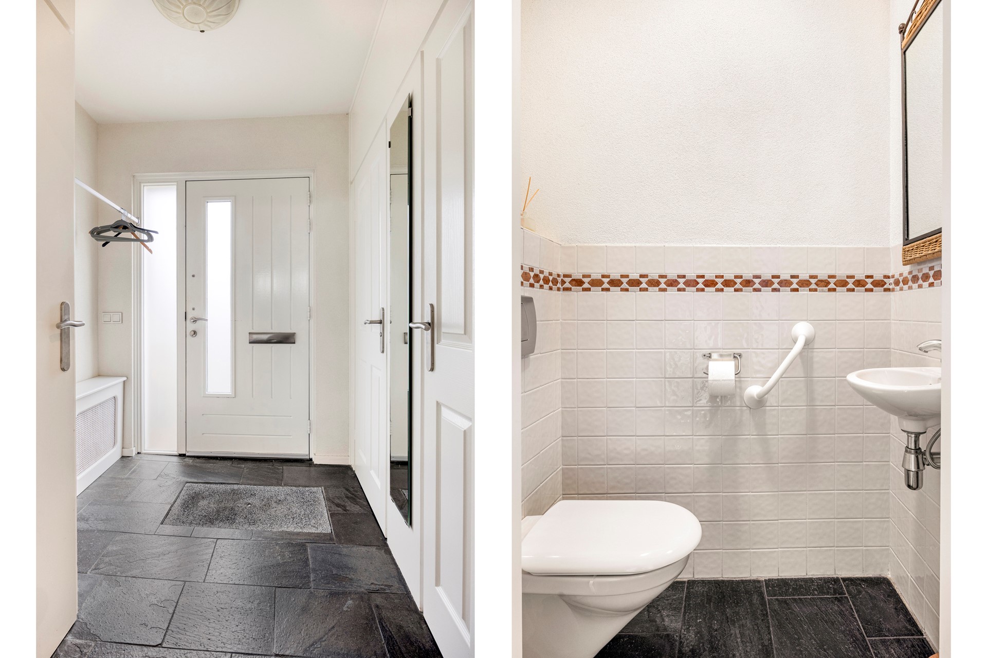 Via de ruime voortuin met inrit en carport bereikt u de hal. Hier bevinden zich het toilet met fontein, een bergkast, de meterkast en de toegang tot de woonkamer.