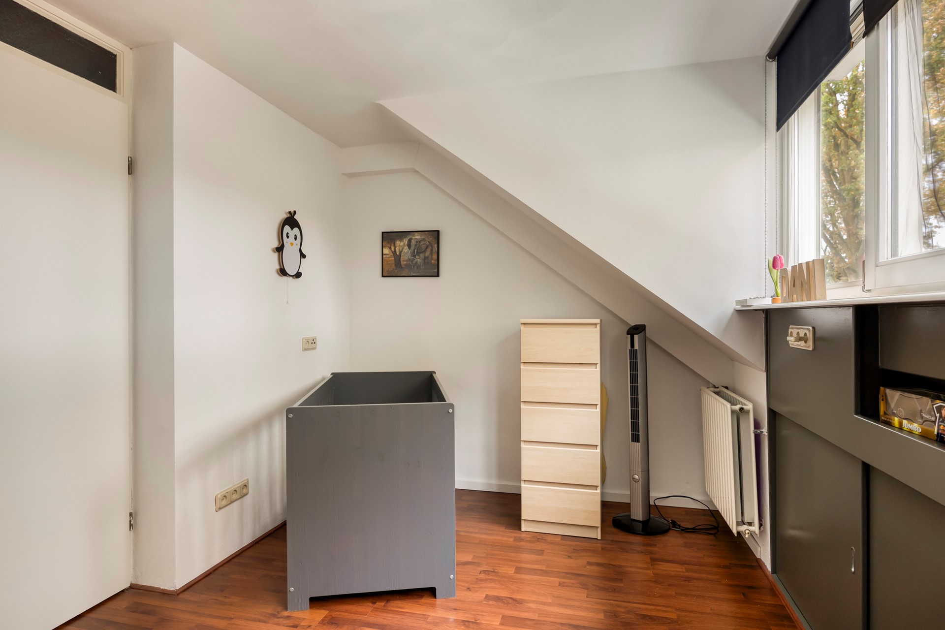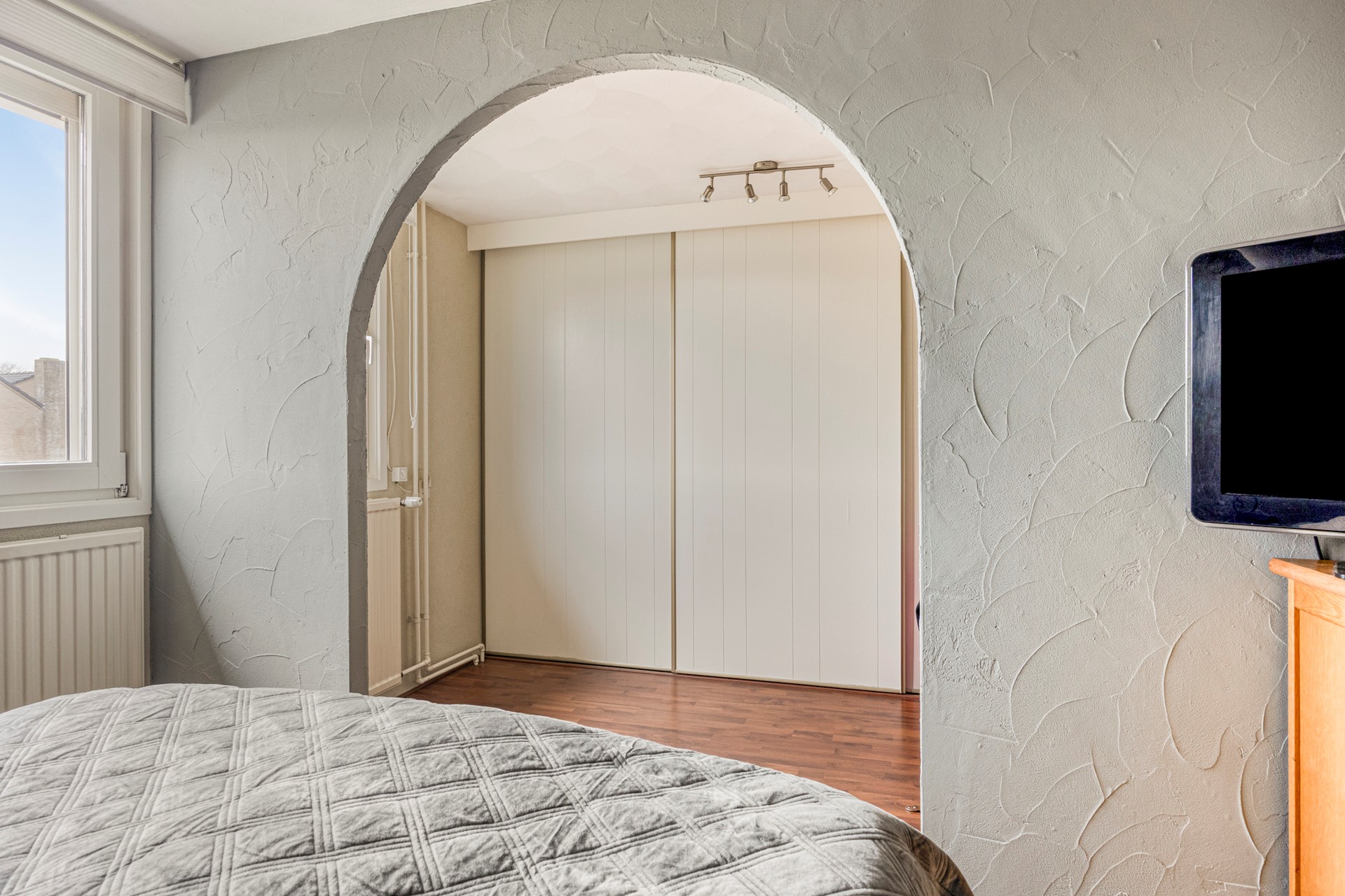 De tweede slaapkamer ligt aan de achterzijde, is eveneens ruim en beschikt over een inbouwkast en extra bergruimte achter de knieschotten. De wanden zijn strak gestukt in lichte kleuren.