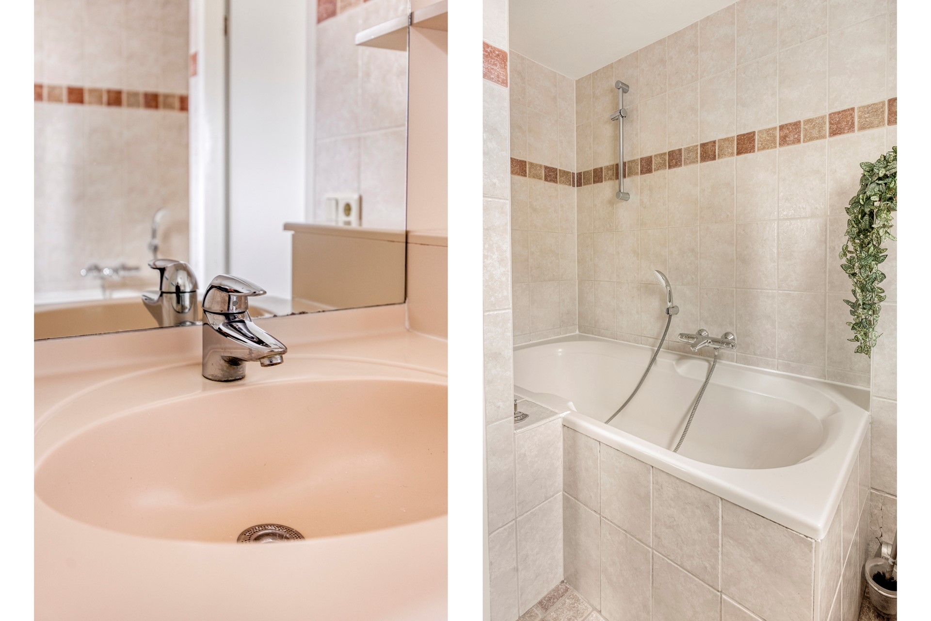De badkamer ligt centraal tussen beide slaapkamers en is volledig betegeld. De ruimte is uitgerust met een ligbad, zwevend toilet en wastafelmeubel.