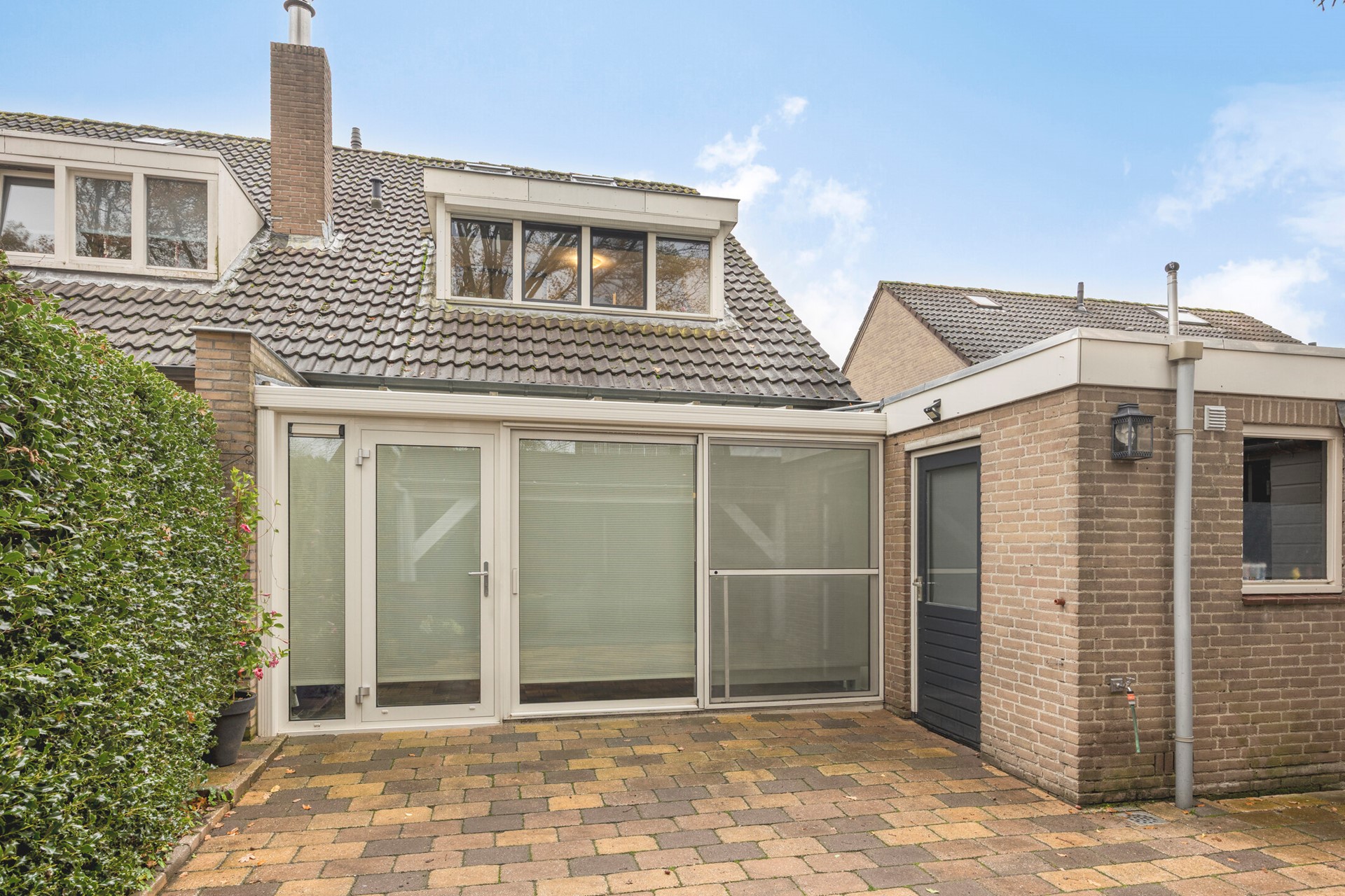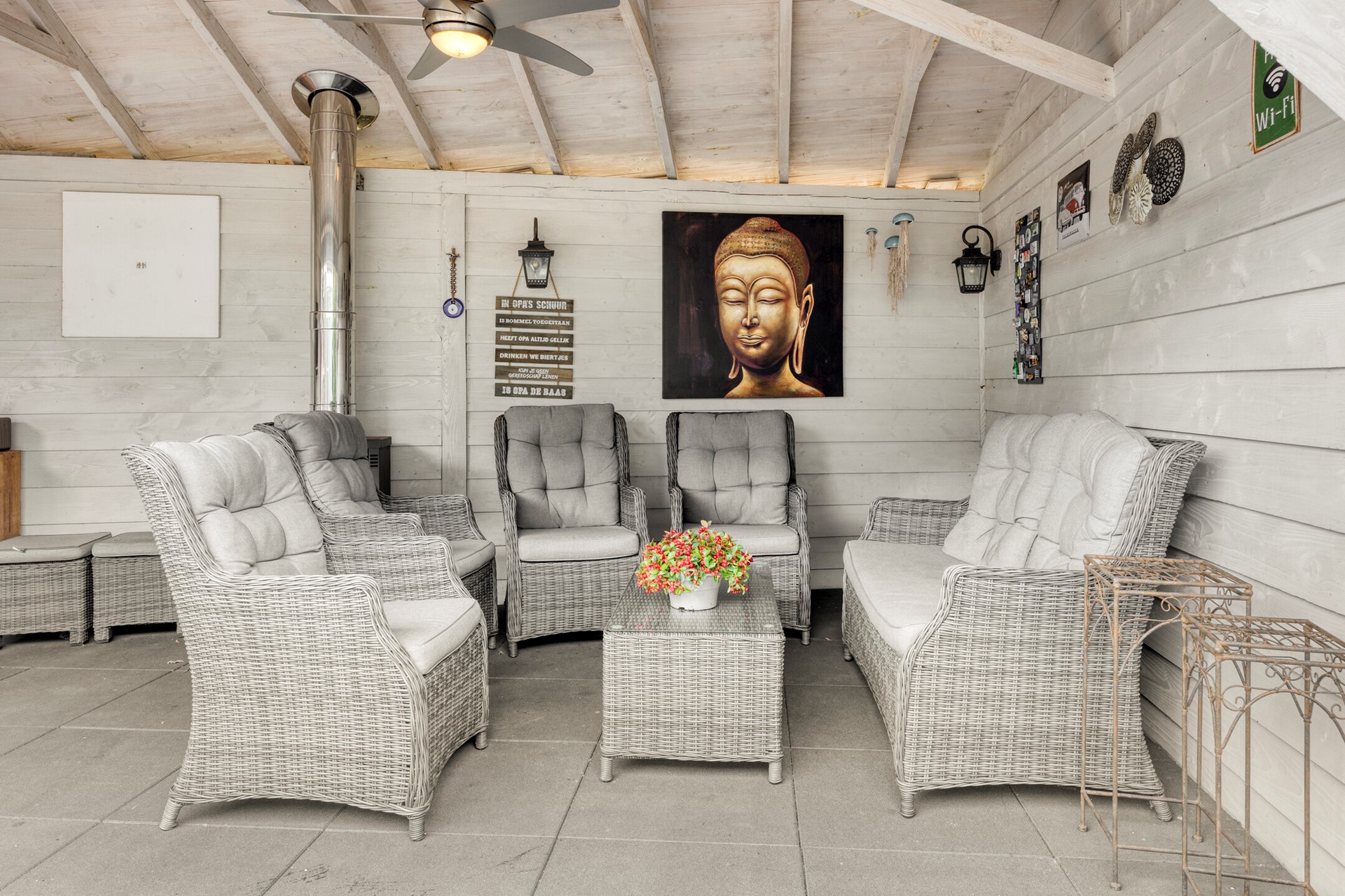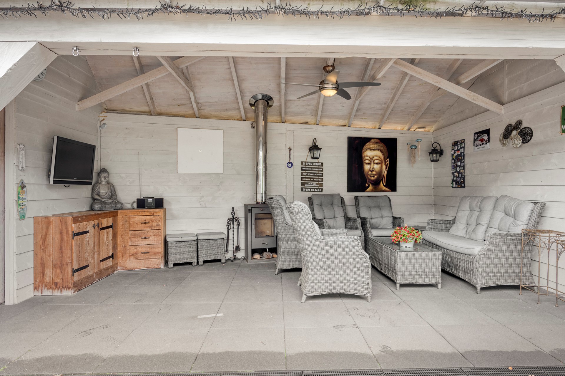 De achtertuin is gelegen op het noorden, volledig verhard en voorzien van een grote overkapping en twee bergingen. Vanuit de achtertuin is ook de garage toegankelijk, huidige bewoners hebben zowel de wasmachine als droger in de geïsoleerde garage staan.