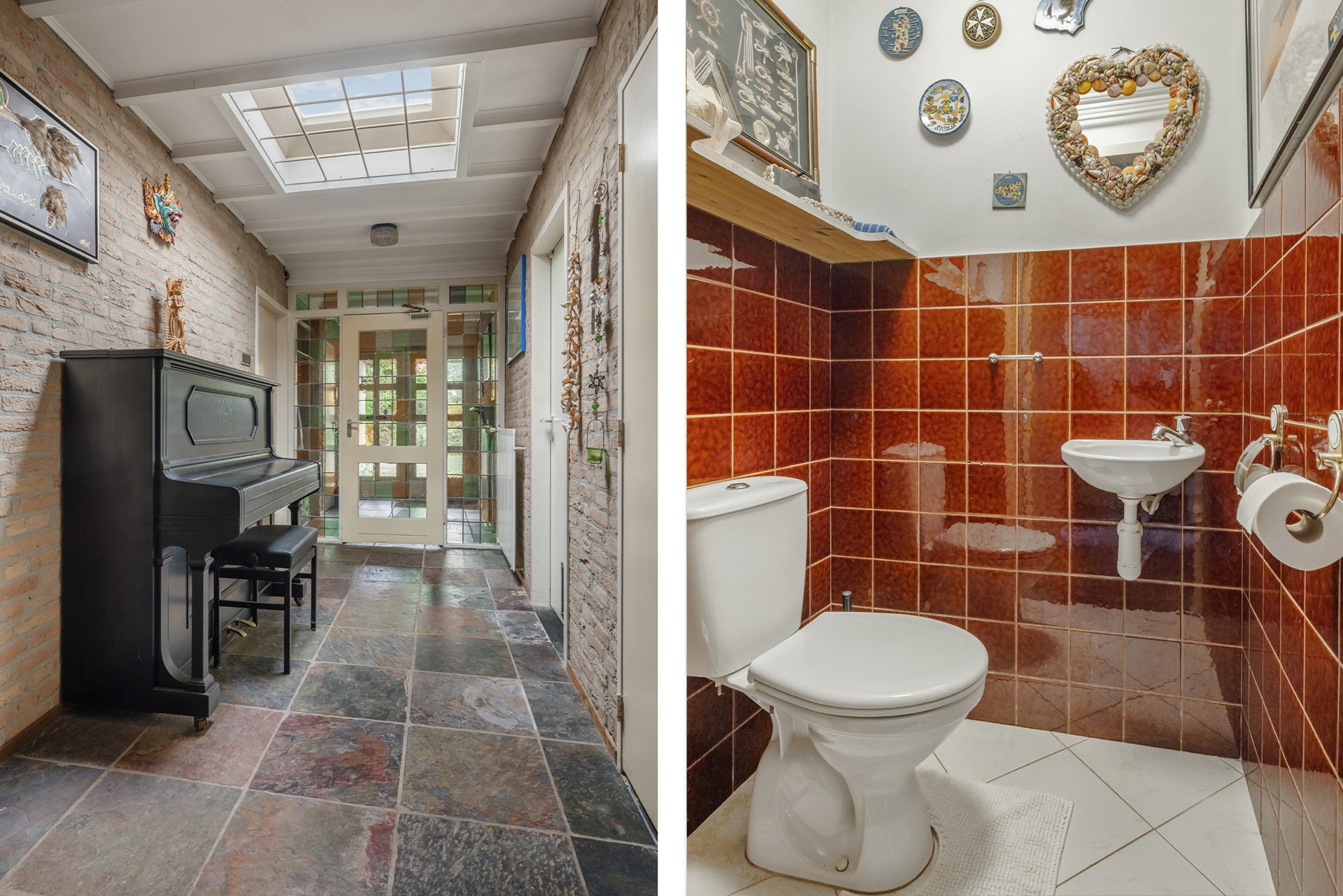Toilet en stookruimte: Verder in de hal bevinden zich het gedeeltelijk betegelde toilet met fontein en de stookruimte met HR-combiketel (2017). Dit gedeelte is afgewerkt met een tegelvloer en schoonmetselwerk.