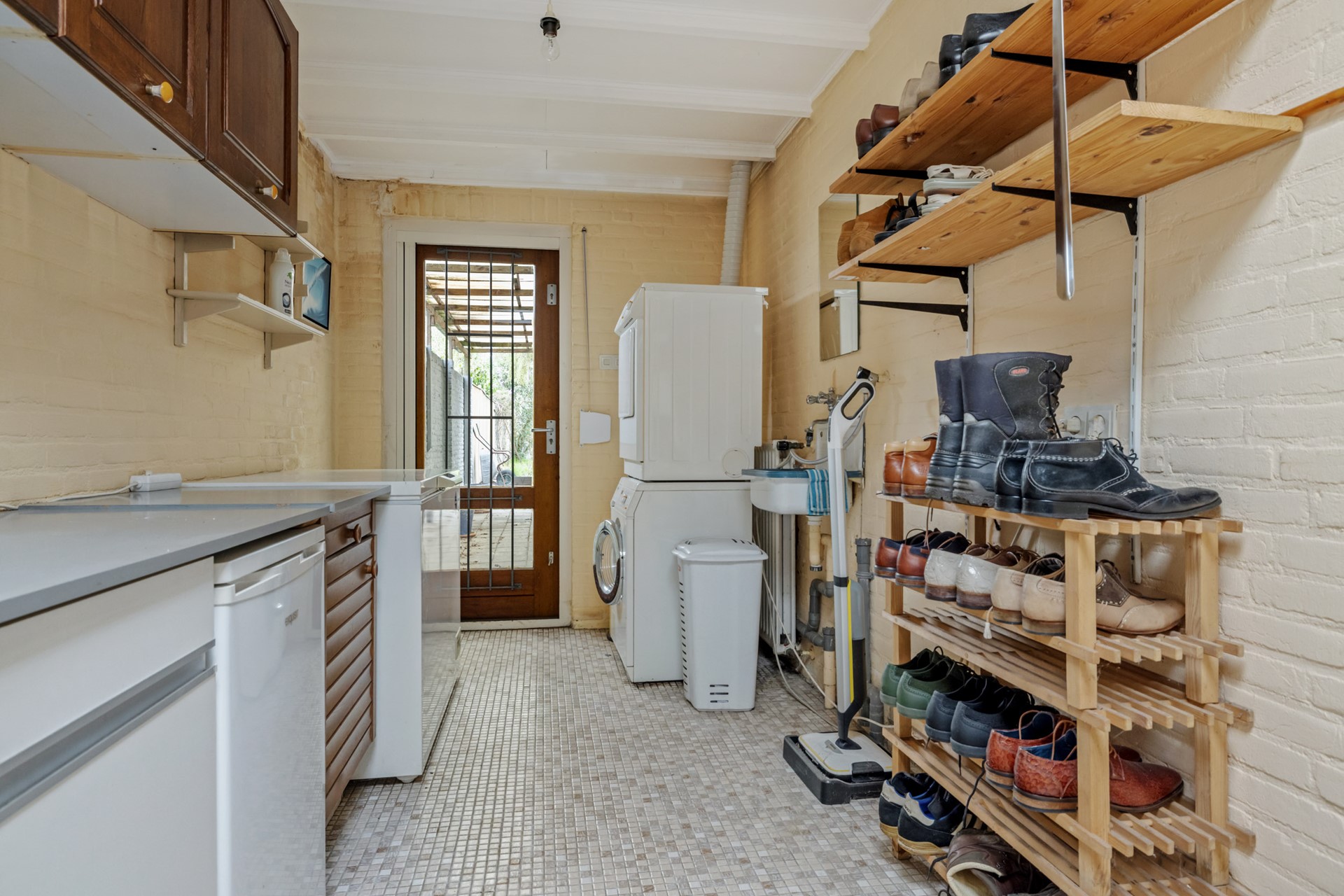 Garage en bijkeuken: Aan de linkerzijde van de hal bevindt zich de praktische bijkeuken, met een keukenblok en aansluitingen voor wasmachine en droger. Vanuit hier heeft u zowel toegang tot de achtertuin als tot de inpandige garage.
