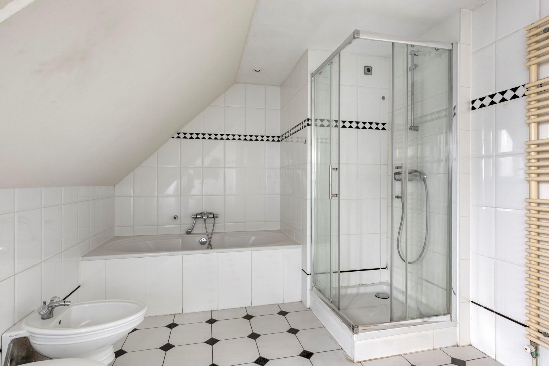 De badkamer is ruim en voorzien van een ligbad, douche, toilet, bidet en wastafel. De badkamer is volledig betegeld en beschikt over een dakkapel aan de voorzijde.